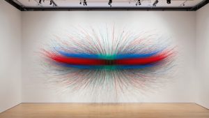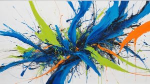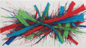 "A chaotic abstract artwork with bold scribbles and vibrant colors."
